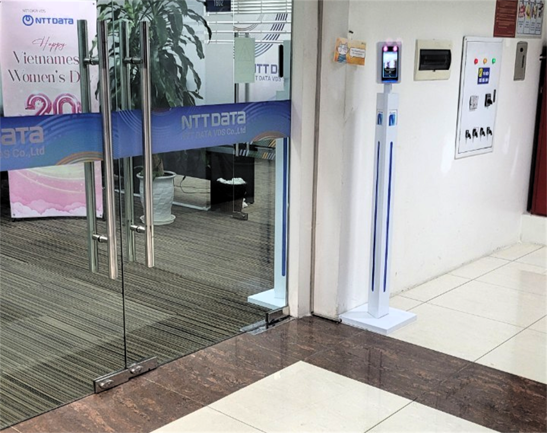 Văn phòng NTT Data VDS tọa lạc tại Tầng 10, 12, 12A và 16 của tòa nhà Thăng Long Tower, được trang bị hệ thống Access Control tích hợp chấm công của Suprema đặt tại các cửa vào ra của văn phòng. Các cửa lối vào được kiểm soát 2 chiều. Nhân viên muốn vào, ra, chấm công cần xác thực thẻ hoặc khuôn mặt trên thiết bị BioStation 3- Suprema.